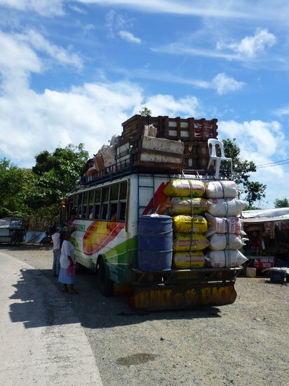 Unser Gepäck wurde zwischen Reis, Lebensmitteln, Wasserkanistern und diversen Baumaterialien wie z.B. Spanplatten auf dem Dach verladen. Um den Bus zu stoppen musste man einfach nur gegen die Außenwand (Fenster gab es nicht) klopfen. Das Begleitpersonal des Bus, wusste meist wer wo aussteigt, und ist daher während der Fahrt schon mal auf´s Dach gestiegen und hat das Abladen der Einkäufe vorbereitet.