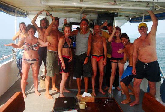 Wir machen morgens den ersten Tauchgang um 7:30 und den letzten und vierten abends entweder im Sonnenuntergang oder als Nachttauchgang. Dazwischen gibt es Fruehstueck, Mittagessen, Obst, Abendessen und entspanntes Abhaengen auf dem Boot. Die Tauchplaetze sind toll aber leider ist oft einfach zu viel los, gerade am Richelieu Rock springen im Minutentakt morgens die Zehnergruppen zum Hupen der Boote ins Wasser...kein Wunder, dass sich alles was groesser ist als ein Giant Trevally schon lange aus dem Staub gemacht hat. So schoen und vor allem fischreich die Plaetze auch sind, Grossfisch wie Riffhaie, Mantas oder gar Walhaie hat man hier schon laenger nicht mehr gesehen. Oyster, der deutsch und englisch sprechende Norweger, der schon seit Jahren hier taucht und lebt, sagt, dass er frueher an solchen Plaetzen wie Koh Bon, das als Manta Point bekannt ist, eine Menge Leopardenhaie und Mantas bei jedem Tauchgang gesehen hat. Heute ist, trotz Manta-Saison, nix los. Aber egal, das tauchen macht allein schon wegen der unglaublichen Fischmengen Spass, die hier rund um uns rum jagen.