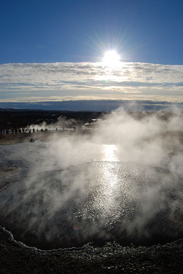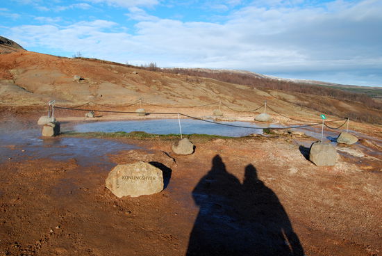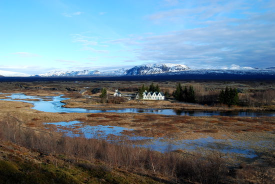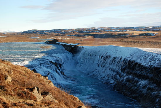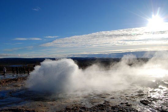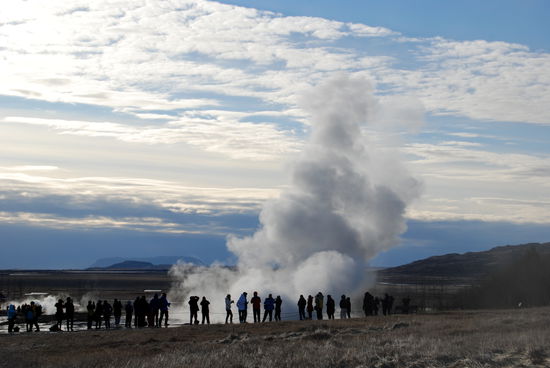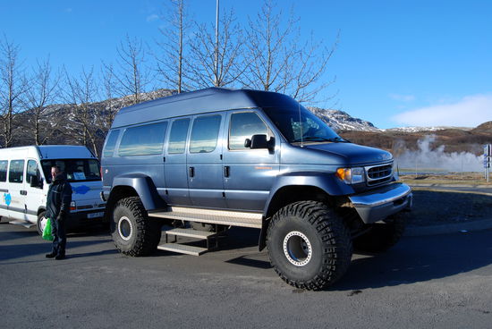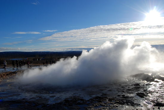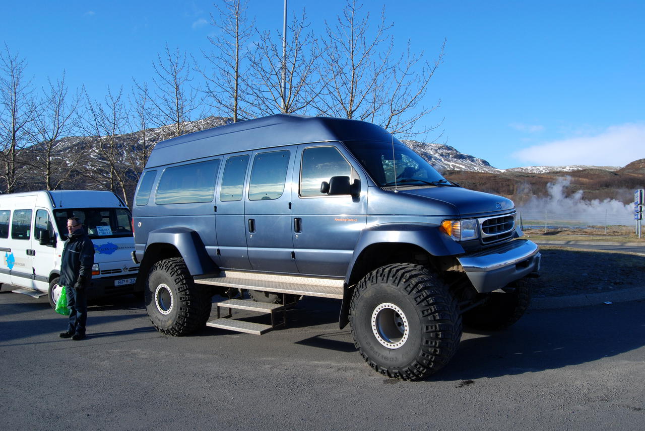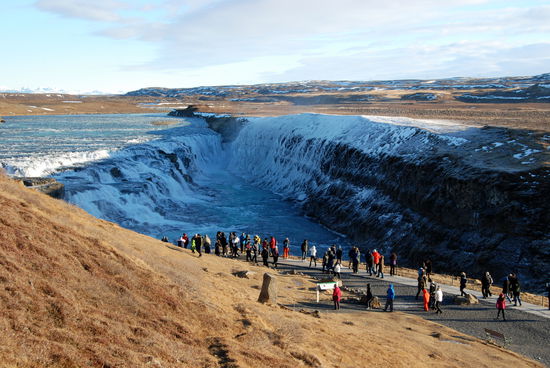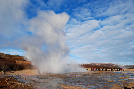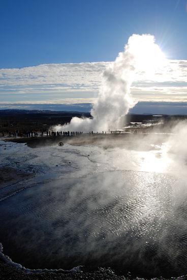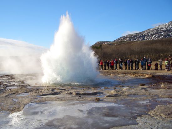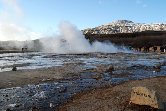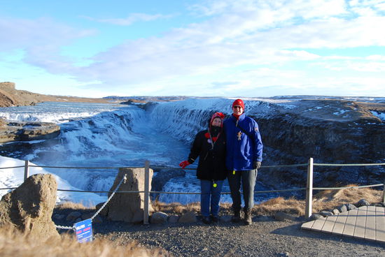 Am nächsten viel zu frühen Morgen ging es auf die große Rundfahrt "goldener Kreis" nach Geysir, zum Gullfoss und nach Thingvellir. Auf dem Weg haben wir eine Tomatenzucht besichtigt. In Island wird der größte Teil des Gemüses in Treibhäusern gezogen, die durch Erdwärme beheizt werden. Leider lag nur noch wenig Schnee, aber es war kalt und die Sonne schien. Unterwegs sahen wir immer wieder schöne typisch isländische Autos, von denen Rainer ganz begeistert war. Am Gullfoss waren die Felswände schön vereist. In Geysir, nur wenige Kilometer entfernt, ist die große Springquelle, von der alle ihren Namen haben, kaum noch aktiv. Alle 5-10 Minuten springt aber sein Nachbar Strokkur, das Butterfaß, als z.Zt. einziger aktiver Geysir. Thingvellir ist immer wieder interessant. Hier driften die eurasische und die amerikanische Kontinentalplatten auseinander. Island wächst jedes Jahr um 2 cm. Seit der Vikingerzeit traf sich hier jedes Jahr im Juni das isländische Parlament - Althing um Gesetze zu beraten und zu verkünden. Am 17 Juni 1944 wurde hier auch die Unabhängigkeit von Dänemark erklärt. Das Althing geht bis ins Jahr 930 zurück und ist damit das älteste bestehende Parlament der Welt.