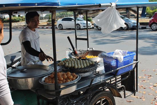 Dann hüpfen wir auf eines der Sammeltaxis auf und lassen uns den kurzen Weg bis zur Tempelanlage für 50 Baht / 1,25 € chauffieren.