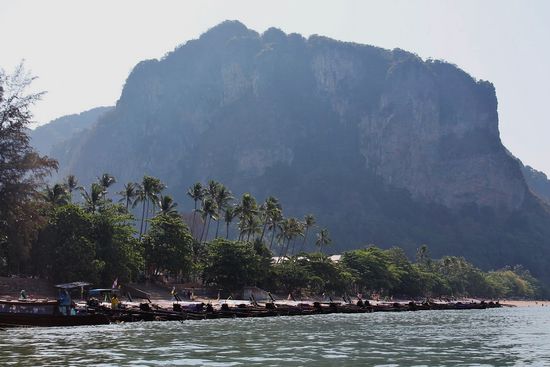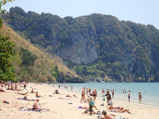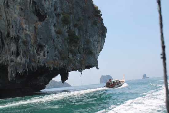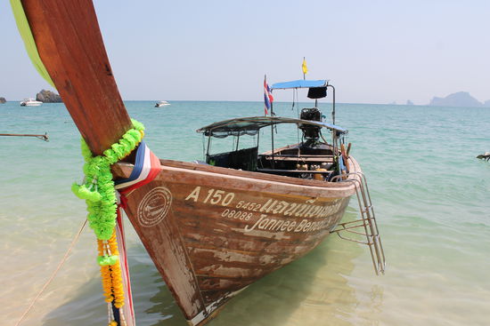 Keine 10 Kilometer Luftlinie vom beschaulichen Krabi entfernt pulsiert hier der Massentourismus in all seiner Herrlichkeit - voller Strand und überteuerte Betten inklusive. Hier springen wir vom Sammelbus ab und lassen uns jeweils der gebuchten Tour zuweisen. Danach besteigen wir eines der unzähligen Boote am Strand und düsen unserer Destination entgegen.