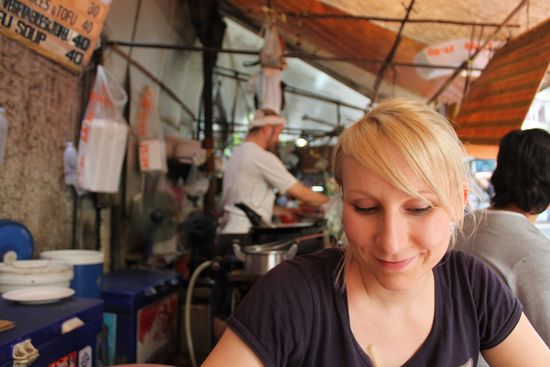 Wir vertrödeln eine knappe Stunde vor dem Büro mit nochmaligem Essen - Pad Thai, was sonst - und bekommen peu a peu Zuwachs von Rucksackreisenden, die wohl alle wie wir Richtung Süden wollen.