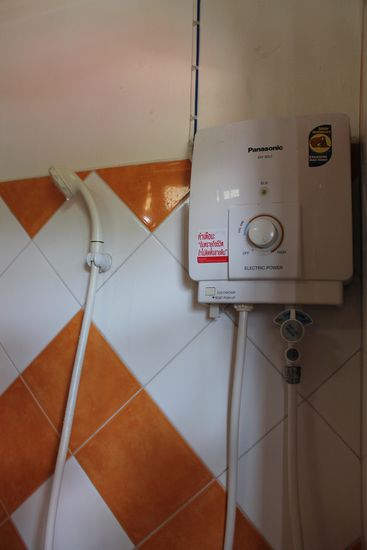 Zudem haben wir Warmwasseranschluss - absolut wichtig bei 35 Grad - und einen eigenen Balkon mit theoretischem Meerblick.