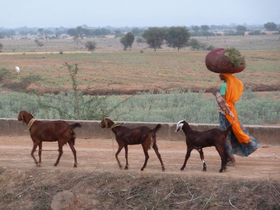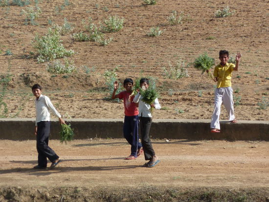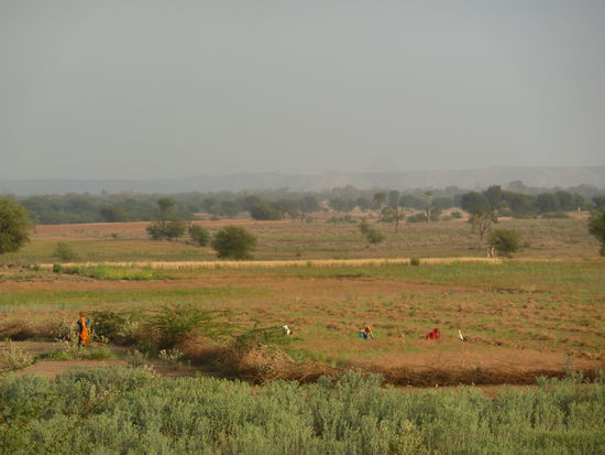 Was eigentlich nur als Notlösung gedacht war, entpuppt sich als wahre Perle. Das Umaid Lake Palace Hotel ist ein Palasthotel, befindet sich zwar in der Nähe der Autobahn, ist aber auf der Rückseite bereits im ländlichen Gebiet. Innen ist alles marmorgefliest und riesengroß. Ebenfalls hintenraus, wie unser Zimmer, ist ein Pavillon, der zum Restaurant gehört. Man blickt auf die Felder, wo gearbeitet wird und ein paar Jungs kommen mit gepflücktem Gras winkend und rufend vorbei. Dort essen wir zu Abend. Da wir zur Zeit die einzigen Gäste sind, erst gegen Abend kommt eine indische Reisegruppe, gesellen sich alle Angestellten zu uns und man kommt ins Gespräch. Für den ärmlichen Jungen, der auch auf dem Feldweg entlang läuft, erbitten sie zwanzig Rupien. Obendrein geben wir ihnen Kugelschreiber, Spielzeugautos und Luftballons für die Kinder in der Umgebung, die wir immer dabei haben und zeigen ihnen, wie man die Ballons quietschten lässt. Darüber sind sie ganz erstaunt und lachen und probieren die Aufziehautos auf dem Boden aus.