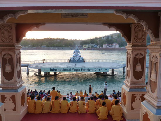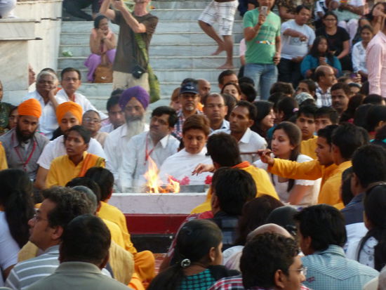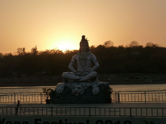 Auch in das gestrige Restaurant mit dem einfallslosen Namen BRUNCH kehren wir ein letztes Mal ein und essen Rahmkäse in Spinat, gefüllte Tomaten, Kartoffelpakoras und Käsetomaten. Wieder ist alles sehr lecker. Dann geht es endlich zum Ashram. Der Parmarth Niketan Ashram ist soweit ich beurteilen kann der größte hier in Rishikesh und zelebriert das Ganga Aarti in großem Stil. Dafür müssen wir diesmal über die zweite Hängebrücke von Rishikesh, die Ram Jhula, hinüber. Die ganze Gasse entlang dem Ganges, wo noch mehrere Ashrams und kleine Tempel stehen, ist voll mit Buden, Verkaufsständen und Läden, wo man Essen, Devotionalien und Touristenkram kaufen kann. Schon von weitem hört man die Zeremonie vor dem Parmarth Niketan und es hat sich eine große Menge Menschen auf den Stufen zum Abendgebet versammelt. Direkt am Wasser thront eine große sitzende Shivastatue und über dem Torbogen am Eingang zu den Ghats ein göttlicher Streitwagen mit vier vorgespannten Pferden. Rund um eine Feuerstelle sitzen die Chefbeter und hin und wieder wechseln die Gläubigen, die sich dazu setzen und ein Hölzchen entzünden dürfen. Diese ganze Zeremonie könnte so besinnlich sein, würden Musik und Gesang nicht über eine auf ohrenbetäubende Lautstärke und bis zum Anschlag ausgesteuerte Anlage übertragen werden. Ich habe auch das Gefühl, dass die ganze Sache ziemlich kommerziell aufgezogen wird, denn ständig springt ein professioneller Photograph herum und macht auch direkt an der Feuerstelle von den Betenden Bilder. Er darf auch als einziger auf die eigentlich abgesperrte Steinplatte, auf der Shiva sitzt. Vom Oberguru Swami Chidanand Sarasvati ist weit und breit nichts zu sehen.