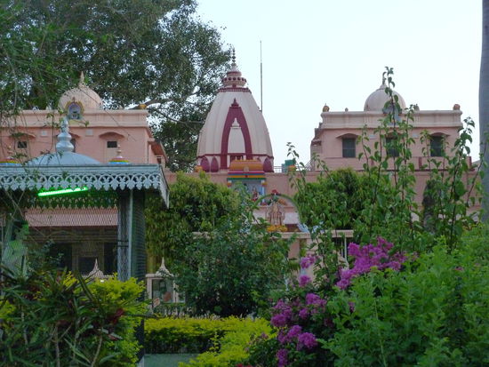 Den Jungs wird das bald zuviel und weil Thomas schon ganz angenervt drein schaut, entfernen wir uns und sehen uns den Ashram selbst an. Auf einer recht großzügigen Anlage verteilen sich tausend! Zimmer, die Gebetshalle, Yogaräume und ein Bereich der wohl der Kontemplation dient, denn hier sind in mehreren Schaukästen zum Teil hinter Glas verschiedene Figuren und Szenen aus der hinduistischen Mythologie ausgestellt. Der große Garten im Zentrum ist sehr gepflegt und man wandelt durch mehrere verzierte Rundbögen, die wie alle Gebäude ringsum in einem orangerosa Farbton gehalten sind. Hier und da sind verzierte Türmchen aufgesetzt und bunte Götterfiguren in den Bögen. Als wir wieder von der anderen Seite des Ganges hinüber schauen, kann man sehen, dass nun auch Fackeln entzündet wurden. Ich hätte mir das gern noch angetan, da wir aber eine Demokratie im Kleinformat sind und in direkter Nähe kein Cafe oder sonstiges existiert, wo die Jungs auf mich hätten warten können, musste ich mich leider der Mehrheit beugen. Irgendwie war das Ganze aber dennoch ein gebührender Abschluss für unseren Besuch in dieser heiligen und von Religiosität durchtränkten Stadt.