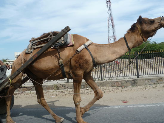 Unerwartet pünktlich steht unser Auto vor zehn vor der Tür. Es ist tadellos in Schuss und hat sogar einen CD-Player und indische CDs dazu. Die Fahrt aus Delhi heraus ist wie befürchtet eine Quälerei. Dafür brauchen wir über eine Stunde obwohl wir schon im südlichen Bezirk starten. Es ist auch erstaunlich, was so alles auf der "Autobahn" unterwegs ist. Fahrräder, Tuk Tuks, Sammeltaxis, die an allen Ecken halten und jede Menge Kühe. Einmal touchiert ein Auto ein Rindvieh, das daraufhin nur zuckt. Irgendwann sind wir in Rajasthan und haben weitestgehend freie Fahrt.