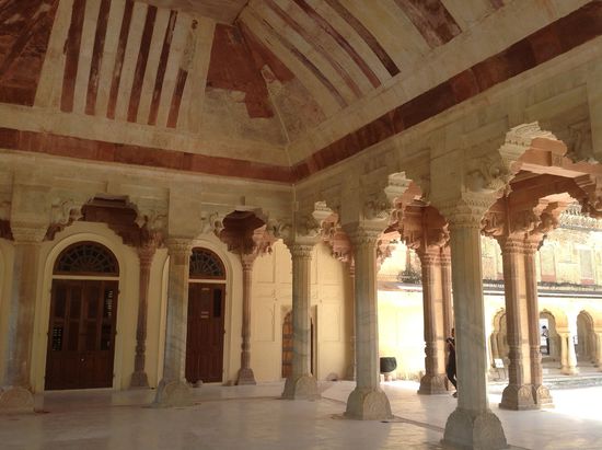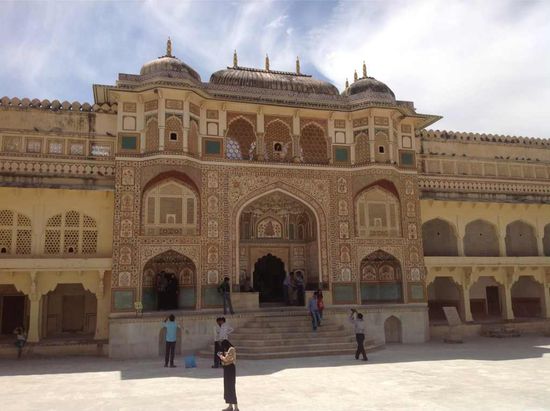 Gegen mittag fahren wir hoch zum Amber Palace, der sich malerisch in einen Berghang schmiegt, unterhalb des Amber Forts. Die ganze Anlage mit dem endlos erscheinenden Festungswall drumherum, den man sich in alle Richtungen erstrecken sieht, ist sehr beeindruckend. Unten stellen wir das Auto ab und laufen hoch zum Palast, wobei man acht geben muss auf die Ausscheidungen der Elefanten (die allerdings emsig eingesammelt werden) und darauf, dasss man nicht von einem Dickhäuter angerotzt wird, denn sie niesen in einer Tour. Sie transportieren Touristen hoch, die nicht laufen wollen.