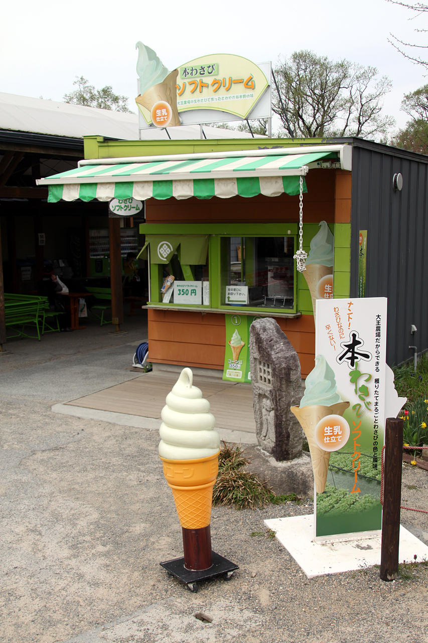 Sehr überrascht waren wir beide, als wir frisch geriebenen Wasabi zum probieren bekommen haben und fanden, dass der gar nicht so scharf ist, sondern eher ein bisschen mit ins süßliche geht. Schade, dass es keine Führung gib, das wäre sicherlich interessant gewesen. Am Ende unseres Rundgangs sind wir dann spontan in ein Restaurant innerhalb der Farm eingekehrt, in der wir wieder Märkchen an einem Automat ziehen mussten. Dank Plastikmodellen und Preisschildern konnten wir uns so einigermaßen orientieren, was wir uns da bestellen. Wir haben eine Nudelsuppe mit Soba, ein bisschen Udon und viel leckeres Wasabi gegessen. Das war zwar nicht geplant, aber dafür lecker. Nur die Luft war ziemlich schlecht in dem Restaurant. Bevor wir uns auf den Rückweg zum Bahnhof machten, habe ich mir noch ein Softeis mit Wasabi gegönnt. Das war Axel dann doch etwas zu exotisch. Ich fand es aber gar nicht so schlecht.