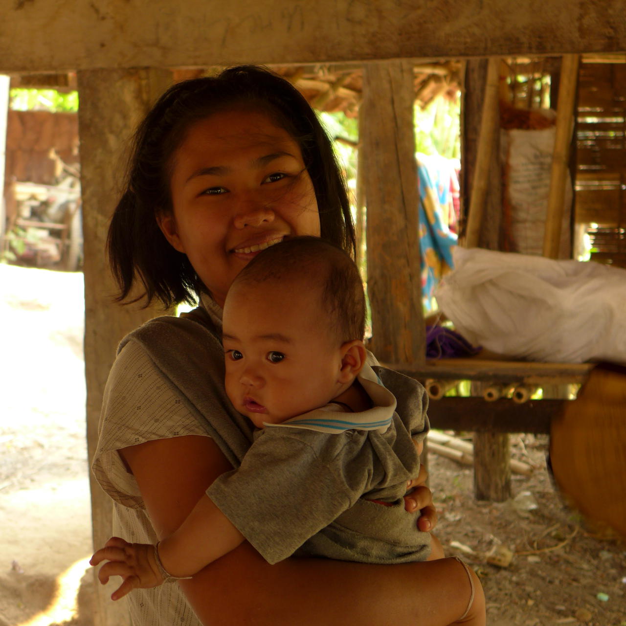 Viel der Bergvoelker in Nordthailand kann man besuchen (hier halt mit der Tourigruppe, okay...). Die sind ueberhaupt nicht fotoscheu so wie diese nette Mami mit ihrem herzigen Kind.
