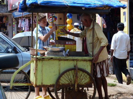 Unterwegs holt sich Nico bei einem Erdnussröster eine Portion zum Knabbern und besteht darauf, dies allein zu tun, gefolgt von den ungläubigen Blicken der umstehenden Inder, die ihm neugierig nachschauen, was er wohl vorhat.