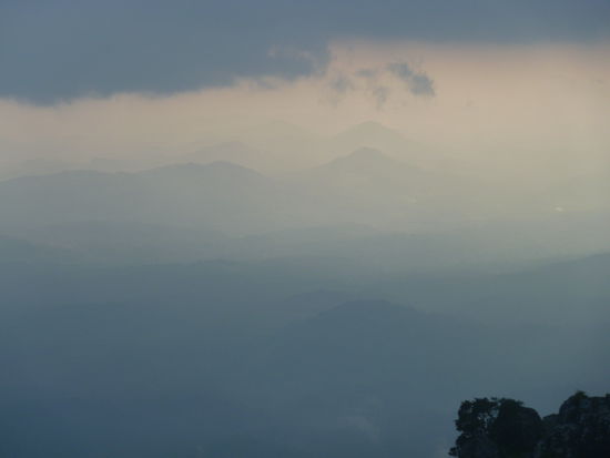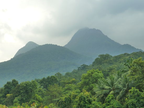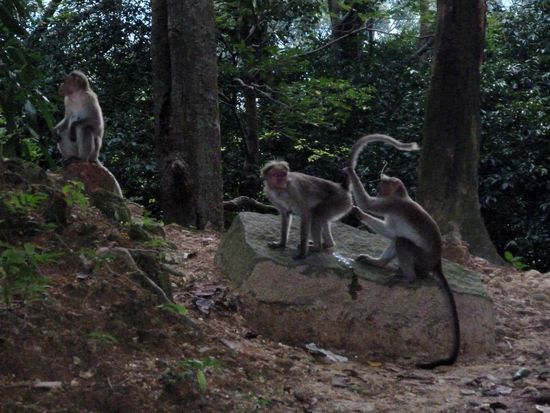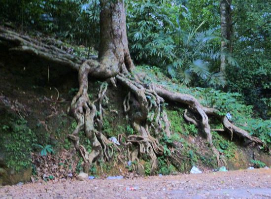 Nun fängt die Straße an, sich in zweiundzwanzig engen Serpentinen den Berg hinauf zu winden. An jeder Kurve hängt ein Schild, das darauf hinweist, wie viele noch folgen. Wir befinden uns in einer Art Urwald mit Bäumen, die seit Anbeginn der Zeiten in den Himmel hinein zu wachsen scheinen und deren frei liegende Wurzen sich wie lange knorrige Finger in den Boden krallen. Die in Indien normalerweise ständig vorherrschende Geräuschkulisse der Zivilisation ist verstummt und an ihre Stelle treten die Stimmen des Urwaldes in vielfältiger Ausprägung. Affen sitzen am Wegesrand und inspizieren uns und ihre Hinterteile. Je weiter wir nach oben kommen, wird die Luft immer kühler und frischer. An einer Stelle steigen wir aus, um Fotos zu machen, denn der Blick geht hinunter in ein Tal, auf dem die Wolken wie dicke Wattebäusche zu liegen scheinen. Obwohl wir nicht besonders hoch sind, befinden wir uns dennoch bereits oberhalb der Wolkengrenze. Wir erreichen den Eingang zum Nationalpark und dürfen nach Entrichtung einer geringfügigen Gebühr die Schranke passieren.