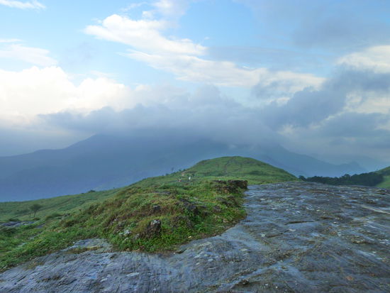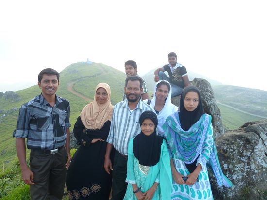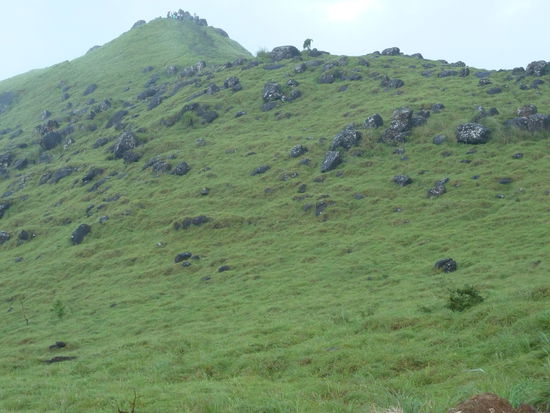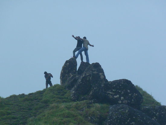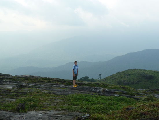 Bis zum höchsten Punkt ist es nicht mehr weit; dort können wir unser "Gürkchen" auf dem Parkplatz abstellen, allerdings nicht ohne die ersten Kommentare zur Verschmutzung des Autos einstecken zu müssen. Hier oben besteht alles aus grünem Gewächs oder schwarzem Lavagestein, das teilweise mit Moosen und Flechten bewachsen ist. Von hier aus hat man in alle Richtungen eine beeindruckende Aussicht, auch wenn der Blick in die Ferne von dem nebligen Dunst getrübt ist. Außer uns sind mal wieder nur Inder unterwegs, die sich wie die Kinder ein Vergnügen daraus machen, laut zu rufen, um sich dann am Echo zu erfreuen. Auf einer letzten Erhebung, die man über einen schmalen Trampelpfad erklimmen muss, stehen verstreut einige Findlinge, die ein tolles Fotomotiv hergeben, wenn man sich darauf stellt. Dort kommen wir mit einer netten moslemischen Familie ins Gespräch und wir fotografieren uns gegenseitig.
