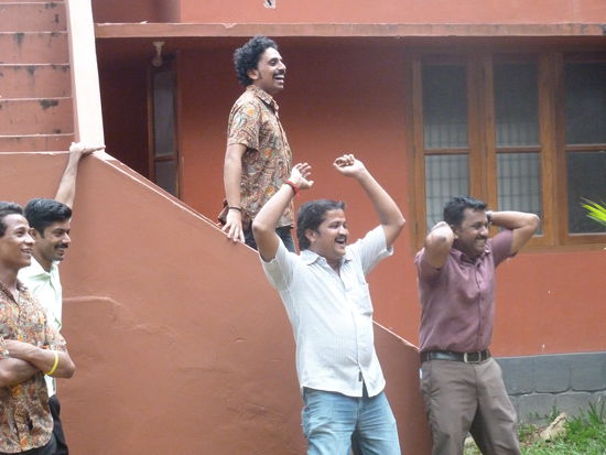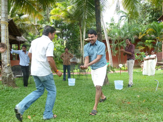In diesem Zusammenhang werden wir heute vom Deshadan dazu eingeladen, an dem traditionellen Festessen teilzunehmen und danach gibt es Wettkämpfe für alle, die aus lustigen Spielen bestehen sollen. Deshalb verbringen wir den Tag bis zum Mittag im Hotel und sind schon ganz gespannt, was uns erwartet. Um zwei werden wir zu Tisch gebeten. In dem Freiluftspeiseraum wurden alle Tische in einer langen Reihe hintereinander aufgebaut und auf den Bananenblättern werden die vielen verschiedenen Speisen aufgetragen. Dabei hilft jeder mit, von den Putzleuten bis zum Manager, bis alles zum Essen bereit ist. Abhilash erklärt uns die Zutaten der verschiedenen streng vegetarischen Saucen und dass eine bestimmte Anzahl zubereitet werden muss. Auch dies hat wieder eine Bedeutung: mit der Vielzahl der Gerichte möchte man den Wohlstand, der zur Regierungszeit des Königs geherrscht hatte, symbolisieren.