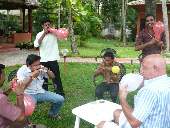 Danach ist Luftballons aufblasen dran. Wer innerhalb von zwei Minuten die meisten Ballons aufgeblasen hat gewinnt. Die Inder benutzen dafür eine ganz eigenartige Technik, indem sie das Mundstück seitlich in die Länge ziehen, damit aber nicht sehr erfolgreich sind. Mit knallroter Birne gewinnt Thomas haushoch mit sechs Stück. Das Zerplatzen der Ballons wird jedes Mal von schallendem Gelächter begleitet.
