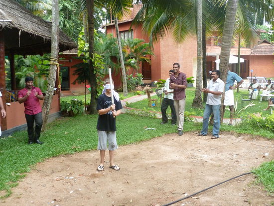 Das anschließende Topfschlagen beginnt Nico. Mit verbundenen Augen und einem Prügel in der Hand, muss er einen Topf, der über einen in die Erde gerammten Stock gestülpt wurde, mit einem Hieb zerschlagen. Thomas hatte ihm vorher erklärt, dass er ihm die Richtung durch die Ansage von Uhrzeiten zurufen wird, was dann auch so gut funktioniert, dass Nico mit einem Schlag das Ding in Scherben verwandelt. Die Inder helfen sich gegenseitig überhaupt nicht, sondern führen den Spieler mit ihren Kommandos in die Irre. Wenn dieser dann daneben haut, freuen sie sich wie die Kinder. Als Thomas dran ist, vereiteln sie unsere Richtungsanweisungen dadurch, dass auf einmal alle gleichzeitig brüllen, was das Zeug hält, damit Thomas uns nicht mehr hört, was ihnen auch gelingt. So bleibt Nico der einzige, der den Topf erfolgreich zerschlagen hat.