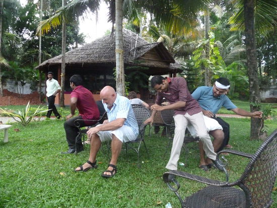 Es folgt die Reise nach Jerusalem, hier "Musical Chair" genannt, mit neun Teilnehmern. Da es aber keine Musik dazu gibt, muss Sandeep, versteckt hinter einer Treppe, damit er niemanden bevorzugen kann, mit einer Trillerpfeife das Startkommando und den Abschlusspfiff abgeben. Nico schlägt sich wacker und beendet die Runde mit dem dritten Platz. Auch hierbei wird viel gelacht, vor allem wenn sich immer mal wieder einer auf dem Schoß eines anderen wieder findet und ausscheiden muss. Das anschließende Armdrücken ist recht kurz, weil nicht viele daran teilnehmen und wahrscheinlich auch weil Thomas gleich zu Beginn, den am stärksten aussehenden Sajin bezwingt, natürlich nicht ohne ihn ein wenig zappeln zu lassen und in falscher Hoffnung auf einen eventuellen Sieg zu wiegen. Als der anschließend den Langen bezwingt, ist seine Ehre wieder hergestellt und diese Spielrunde beendet.