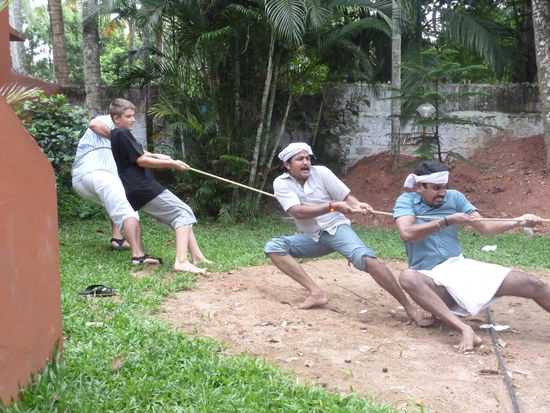 Das letzte Spiel ist Tauziehen. Bereits im Vorfeld war ausgemacht worden, dass Thomas und Nico in Sandeeps Team mitmachen. Sie treten gegen ein Team vom Deshadan an mit Unterstützung des Ayurveda-Mannes. Alle legen sich mächtig ins Zeug, aber wie nicht anders zu erwarten war, gewinnt natürlich die Mannschaft, in der Thomas mit zieht. Natürlich folgt daraufhin ein Super-Bodycheck zwischen Nico und Sandeep. Nach zwei Durchgängen wird Thomas gebeten auszuscheiden, damit das gegnerische Team eine Chance zu gewinnen hat. An seine Stelle tritt der schmächtige Arzt und es war abzusehen, dass die Gruppe nun verliert.