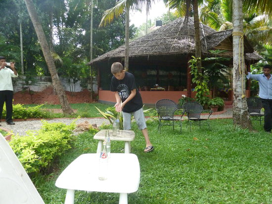 Damit sind die Wettkämpfe beendet und später soll die Siegerehrung folgen. Die lässt aber ganz schön auf sich warten, also suchen wir zunächst Abkühlung und Erholung am Pool. Ausgerechnet zur allabendlichen Ankunftszeit der Mücken findet schließlich die Siegerehrung statt. Abhilash hält eine kleine Rede dazu. Das ganze Team bestehe nun seit fünf Jahren und es sei das erste Mal, dass sie dazu Hotelgäste eingeladen hätten und das wichtigste dabei war nicht das Gewinnen, sondern der Spaß. Er bedankt sich bei uns für unsere Teilnahme und er würde sich sehr freuen, wenn wir im nächsten Jahr beim Onam wieder dabei wären. Es gibt auch keinen Gesamtsieger, sondern jede Disziplin wird einzeln bewertet, so dass es viele verschiedene Sieger und Zweitplatzierte gibt. Der erste Preis ist jeweils ein Getränk, vorher noch schnell in Ermangelung an Geschenkpapier in Alufolie eingewickelt. Für die Männer gibt es Bier, für die Frauen und das Kind Cola. Auch Shah, der jetzt erst seinen Dienst antritt, bekommt netterweise eine Bierflasche in die Hand gedrückt, obwohl er an den Spielen gar nicht teilgenommen hatte.