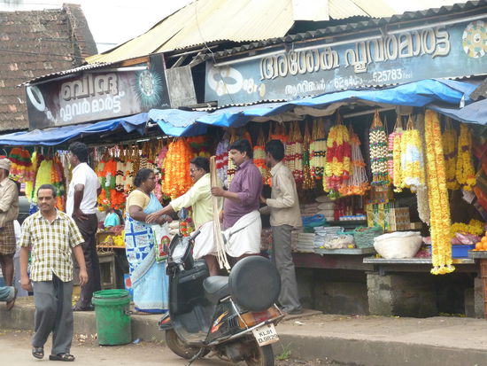 Nach einiger Zeit erreichen wir Kovallam. Dies ist der Haupttouristenort von Kerala mit den meisten Hotels und am weitesten für internationale Gäste entwickelt. Zuerst fahren wir allerdings am Hauptstrand vorbei und kommen an einer Stelle ans Meer, wo sich die Palmen gemächlich im Wind wiegen und eine leuchtend rosa Moschee direkt am Strand steht. Hier tummeln sich nur Einheimische, aber es gibt weiter nichts Interessantes. Also wenden wir und begeben uns zum eigentlichen Kovallam Beach. Die erste Ernüchterung erfolgt, als man uns sofort Parkgebühren für das Abstellen des Wagens abknöpft. Die Tuch- und Obstverkäufer sind hier so aufdringlich und hartnäckig, wie wir es in noch keinem von uns bereisten Land erlebt haben. Während unseres maximal einstündigen Aufenthaltes belästigen uns einige davon bis zu fünf Mal!