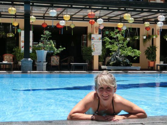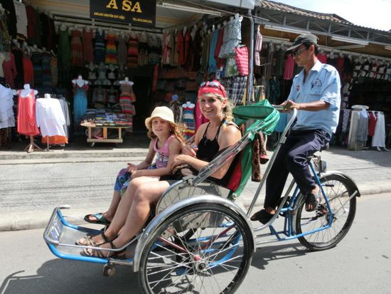 Zurück in Hoi An nehmen wir nach etwas zäher Verhandlung (statt "Anfangsgebot" 10Euro landen wir bei 4Euro) zwei typisch vietnamesische Fahrrad-Rikschas und lassen uns erstmal zurück ins Hotel fahren. Abkühlung im Pool!!