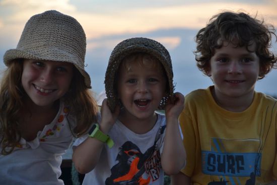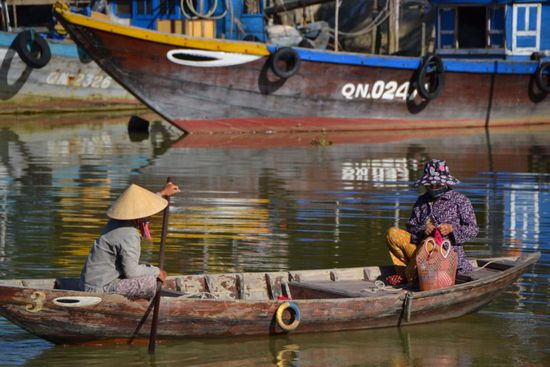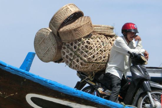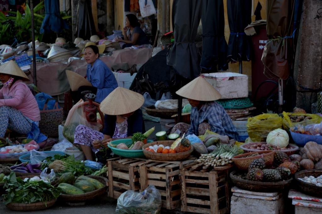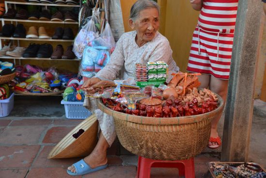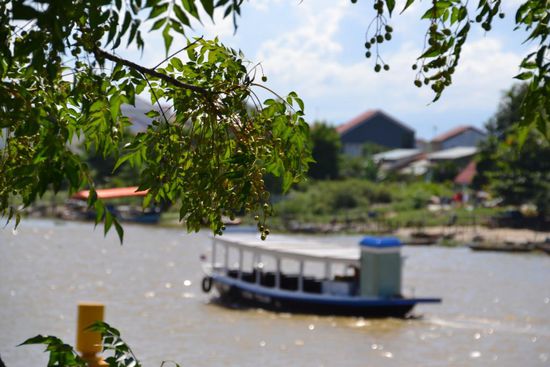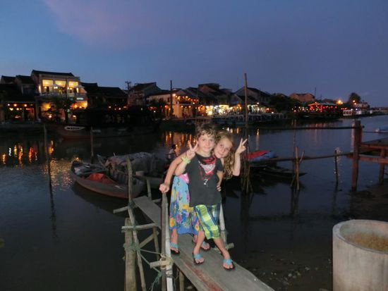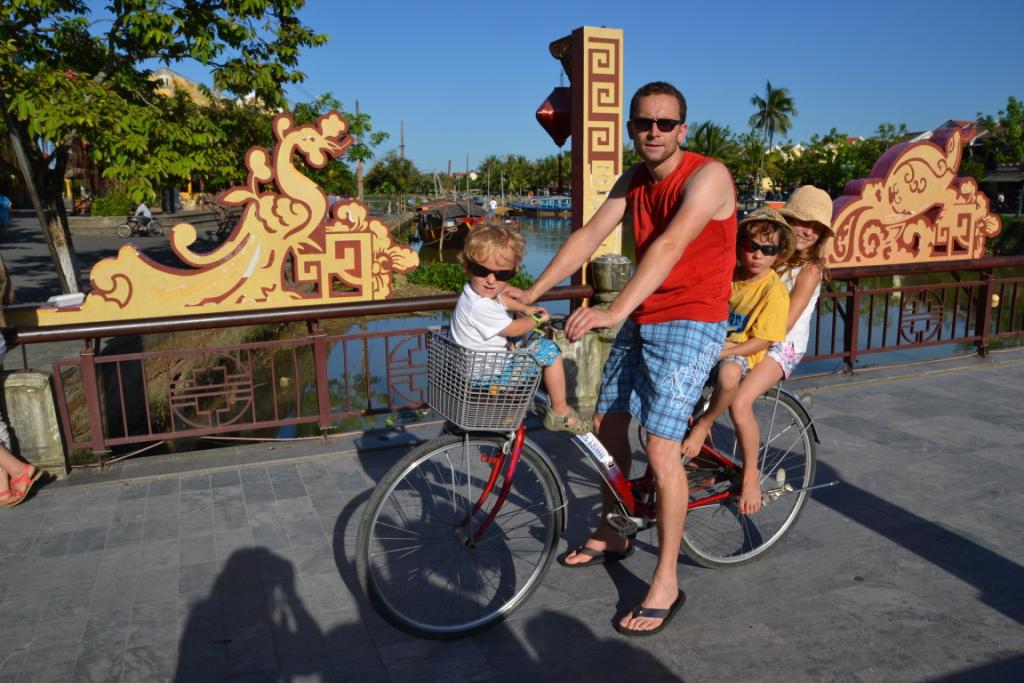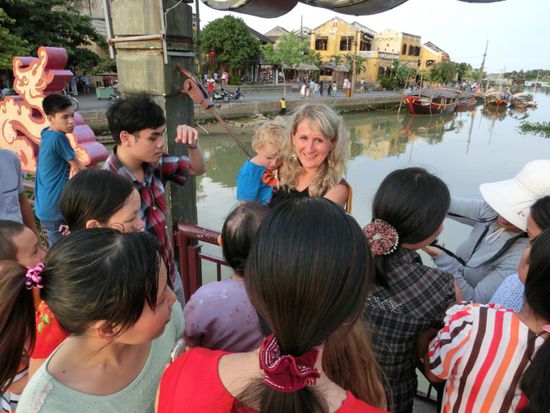 Wir baden im Pool - die Kinder sind gar nicht mehr raus zu bekommen, radeln nach dem Mittag zu fünft mit 2 Fahrrädern vom Hotel in die Stadt und buchen gleich einen Ausflug nach My Son für den nächsten Tag. Wir erkunden eine der umliegenden Inseln, gern auch abseits der normalen Pfade und entdecken etwas die Straßen der Einheimischen. Später geht es zum Hafen. Markt, frisches Obst, kleine Museen, sehr warm - wir lassen uns am Fähr- und Fischerhafen nieder, beobachten das rege Treiben am Pier und trinken frische Fruit Shakes - lecker, lecker! Es ist grad Feierabendzeit und die Arbeiter schlagen hier wie die Ameisen auf, um mit ihren Rädern und Moppeds auf eine der einfachen Fähren zu kommen, über den hier mündenden Fluß überzusetzen und in ihre Dörfer auf der anderen Seite zu gelangen. Wir kaufen ein paar Kokos-Snacks (sehr lecker) von den einheimischen Händlern und verabreden uns für 17Uhr zur Sunset-Tour auf dem Fluss mit einem der vielen eifrigen Anbieter. Bis dahin radeln wir noch etwas durch die bekannte Altdtadt Hoi Ans bis zur alten Japanischen Holzbrücke. Wir sind immer wieder der Hingucker, wenn wir mit Matteo im Körbchen vorn und den beiden Anderen hinten auf dem Gepäckträger durch die Straßen rollen.