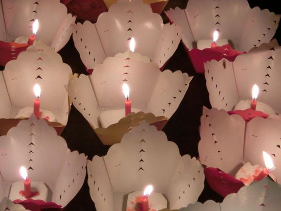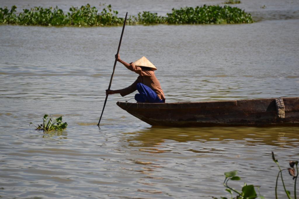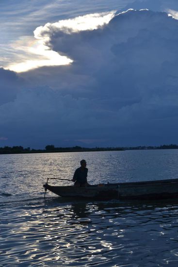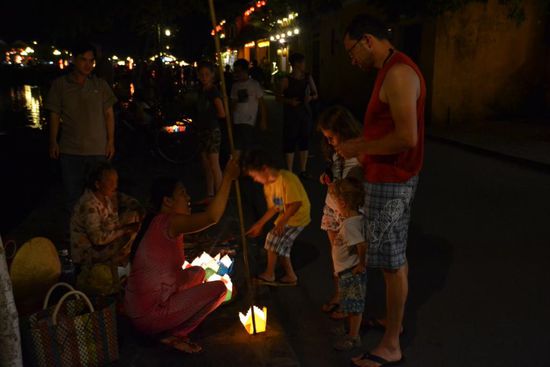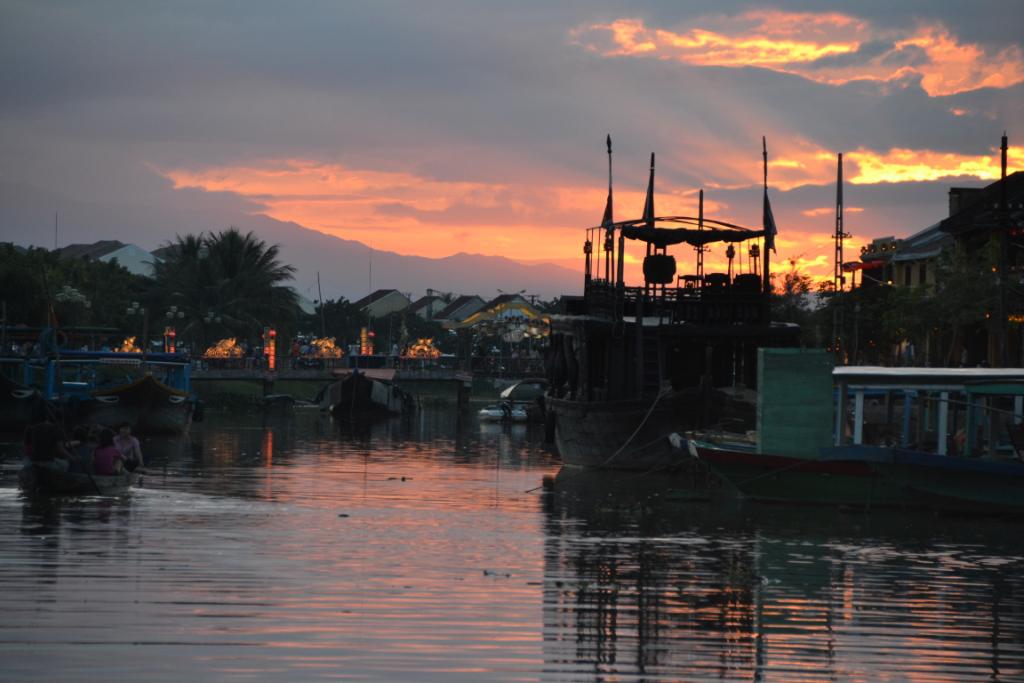 Wir besteigen später Mr. Rin's Boot und tuckern aus dem Hafen. Die Kinder dürfen steuern, wir können die leichte Brise genießen, die etwas Abkühlung beschert. Wir beobachten die letzten Fischer an diesem Tag, schippern durch die Flussarme und an den Inseln entlang. Etwas eingeschränkt durch Wolken kommen wir zu sehr schönen Sonnenuntergangsfotos Richtung Berge im Westen. Als wir von Board gehen, stellt sich eine fast unvergleichliche Atmosphäre in diesem reizenden Fischerdorf bzw. früheren Handelsort ein, die besonders abends ihren Reiz hat. Unzählige Restaurants am Wasser, Live-Musik und andere Präsentationen, Kinder sitzen mit gebastelten Kerzen-Schiffchen am Straßenrand, welche man kaufen und im Wasser treiben lassen kann. Ein schönes Lichtermeer. Wir entscheiden uns für leckere Holzofen-Pizza, eine angenehme kulinarische Abwechslung an diesem Abend. Erst spät radeln wir zurück durch die Gassen zu unserem Hotel. 21Uhr noch kurz schwimmen im Pool, bevor alle Müde ins Bett fallen.