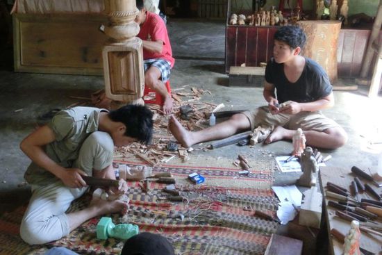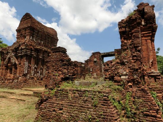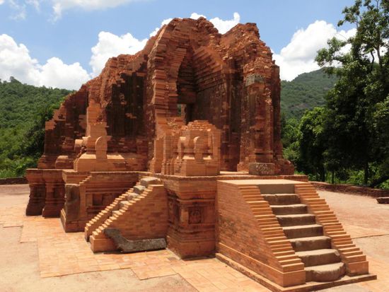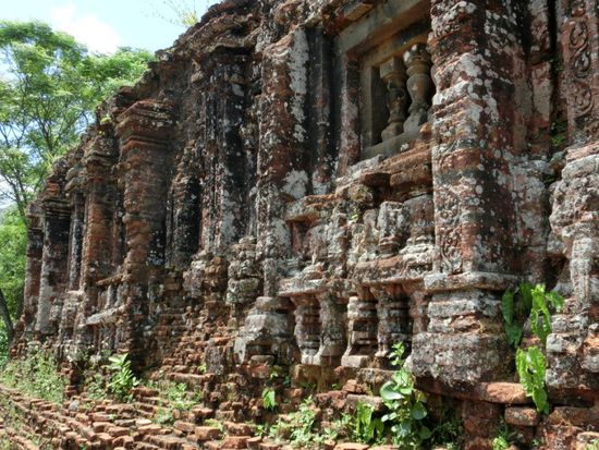 Heute müssen wir schon 7Uhr frühstücken, 7:45Uhr holt uns der Bus ab und es geht 50km ins Hinterland durch Reisfelder und Dörfer Richtung Berge. Hier ist das Land nur knapp 100km breit und wir sind nur noch ca. 200km südlich der ehemaligen Grenze und Kriegszone zwischen Süd- und Nordvietnam. Die einstige zentrale Cham-Stätte My Son ("Beautiful Mountain") liegt in einem Talkessel umgeben von Bergen und ist seit wenigen Jahren UNESCO-Weltkulturerbe. Leider haben die Amerikaner hier in der 'Free fire zone' auch historisches Gut ohne Rücksicht zerstört und so sind wohl von einst über 70 Tempeln nur noch 20 übrig geblieben. Die 'Stadt' aus dem 4.-10. Jhd. ist demnach nicht mehr so beeindruckend und groß, wie erwartet, bzw. im Vergleich zu anderen - z.B. letztes Jahr Sukothai. Unser Guide erklärt uns einige Dinge, der Planet fängt mächtig an zu brennen, wir machen schicke Fotos und nach geraumer Zeit fahren wir zurück. Wir besteigen 10km vor Hoi An noch ein Boot, es gibt Mittagessen inkl. sehr angenehmen Fahrtwind.