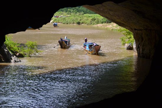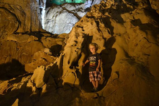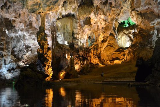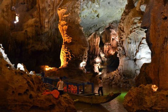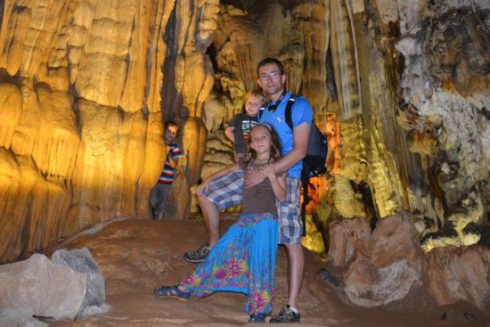 Wir shippern mit dem Boot direkt in die Höhle hinein. Der Motor wird ausgeschaltet und 2 Personen steuern per Paddel ca. 500m tief ins Innere. Neben vielen interessanten Motiven ist diese Fahrt sehr schön. Der unterirdische Fluss ist mehr als 17km lang, das gesamte Höhlensystem ca. 70km und damit das Größte der Welt. Moment... Größte der Welt? - das hatten wir doch schon 2003 in Malaysia im Gulung Mulu NP - Chemnitzer Rucksackträger - ihr erinnert euch? Tatsächlich wurden die Ausmaße hier erst in den letzten Jahren erforscht und die Anerkennung als größtes Höhlensystem zudem mit der größten Höhle (etwas entfernt und nur per organisierte Expedition für 3000$ begehbar) wurde erst 2009 offiziell. Nach der Rundfahrt gehen wir innerhalb der Jellyfish-/Quallen-Höhle noch an Land und laufen später aus dieser heraus. Per Boot nun zum Ausgangspunkt und Bus zurück. Jetzt wird es lustig. Als wir bereits im Bus sitzen, kommt eine Gruppe zottliger Backpacker an, alle 8 sollen noch in den 23-Sitzer Bus. Einige Klappsitze sind noch vorhanden, Manche haben jedoch für die nächste Stunde, bis ein paar Leute aussteigen, keinen Platz; der Guide steht die 4h zurück. Die Kinder halten super durch, auch wenn wir erst im Dunkeln mit 2h Verspätung in Hue ankommen. Wir essen noch in unserem Stamm-Restaurant - etwas abseits des Trubels - und dann schnell zurück ins Hotel.