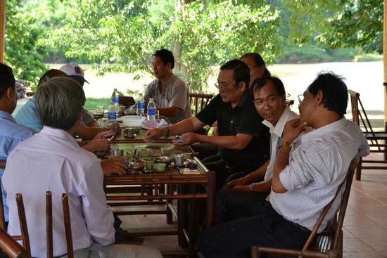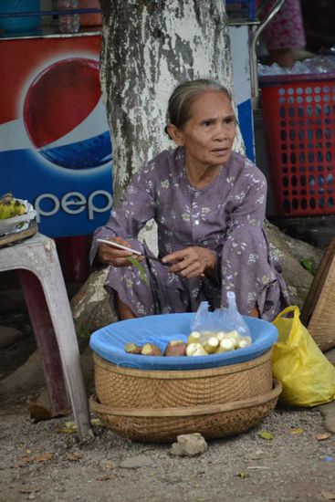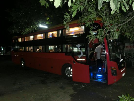 Nach 2,5h kommen wir zurück zu unseren Cyclos, es geht noch kurz in einen Bonsai-Garten und später an Onkel Ho's Elternhaus vorbei. Er wurde wenige Kilometer von der Stadt entfernt geboren und hat später an der Hochschule in Hue studiert. Sicherlich deshalb ist es wohl sehr schwierig, hier einen Studienplatz zu bekommen. Wir stoppen danach am großen Markt am Fluss. Hier ist es eng und sehr lebhaft. Verkäufer über Verkäufer. Nach einem kleinen Rundgang und dem Kauf weniger Souvenirs flüchten wir und lassen etwas außerhalb eine Melone für uns schlachten, immer beäugt von vielen Augen. Nun geht es zurück Richtung Hotel. Als wir an unserem Stamm-Restaurant ankommen, ist es bereits 16:15Uhr. Es gibt noch schnell Mittags-Abendbrot und dann zurück zum Hotel. 16:55Uhr sind wir da, 17Uhr soll die Abholung erfolgen. Kurz umziehen und warten. 17:15Uhr kommt ein Typ per Motorrad vorbei und will uns mit zum Bus nehmen. Wir wären 16:50Uhr zur Abholung nicht da gewesen...stimmt, war ja auch nicht ausgemacht. Zu Fünft auf dem Mopped mit all unserem Gepäck (die Zusatztasche haben wir inzwischen schon )) - das wird nix! Schnell organisiert er uns ein Taxi und wir fahren nur 3 Minuten um den Block zu unserem Sleeping-Bus, der bereits recht voll ist.