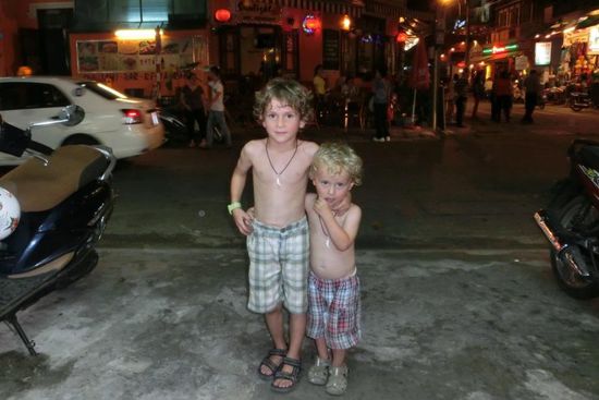 So kommen wir auch schon nach 3:15h Fahrzeit in Hue an. Wir bepacken nur 2 Cyclos mit uns 5en und allem Gepäck und lassen die Jungs in die Pedale treten. Es geht zu unserem noch am Vortag gebuchten Valentine Hotel am Rande der Innenstadt. Es ist natürlich ein Rückschritt zum letzten Hotel, was uns erst mal etwas deprimiert, kostet aber am Ende auch nur ein Viertel (15€ für Alle im Dreibett-Zimmer inkl. Frühstück). Zum Schlafen reicht es. Es ist schon spät, die Familie schiebt Hunger, also erstmal ein nettes 5-Gänge-Menu für knapp 3€ gewählt, 2 Bier dazu, dann ist die Laune schon wieder etwas besser. Das Angebot der Vermittlung des 'nice girl' vom Hotel schräg gegenüber lehne ich dankend ab und verweise auf die 30m hinter mir laufende Familie. Wir finden beim 4. Versuch eine sehr gut englisch sprechende Reise-Agentur und während die Kinder auf den Motorrädern der Angestellten mal Gas geben können und Nevio einen Höllenlärm macht, plane und buche ich den Tagesausflug (Citytour) für den nächsten Tag und gleich die Weiterfahrt nach Hanoi in 3 Tagen. Es geht dadurch recht spät ins Bett, ich schlafe noch vor Mitternacht, Anja erst wieder gegen 1:30Uhr.