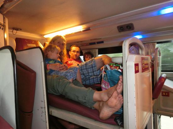 Aber...die von uns reservierte obere letzte Reihe ist wirklich noch frei.Wir sitzen/liegen gerade, schon geht es los. Die Hektik legt sich und wir rollen nordwärts aus der Stadt, ca. 650km in 13h durch die Nacht liegen vor uns. Der Bus hält noch mal am Straßenrand auf der Gegenspur und wird noch tonnenweise mit Handelsware bepackt. Später gegen 20Uhr gibt es noch eine Restaurant-Pause, ehe es von nun an non-stop durch die Nacht geht. Natürlich schläft man auf so einer Fahrt nicht durch, Matteo ist etwas unruhig, die anderen Beiden schlafen aber sehr entspannt. Einzig die nervige Toilettentür und das ständige Begängnis sind sehr störend!
