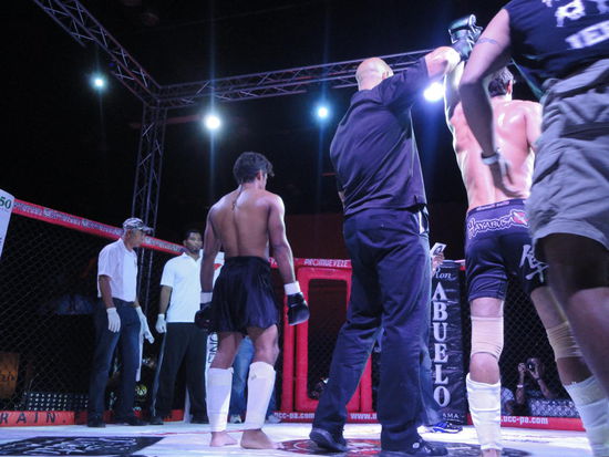 Aus diesen Gründen gibt es sehr viele Merkmale, an dessen ein MMA Fight bewertet werden muss. Aggressivität, Kontrolle des Käfigs, Angriffs- und Verteidigungstechniken, Take Downs (Gegner zu Boden bringen), physische und psychische Überlegenheit, Punkte durch Boxen (Striking) und Tritttechniken Im Stand und vieles mehr. Ich weiß natürlich, wie ein Kickboxkampf gewertet wird, in dieses Thema musste ich mich allerdings vorher noch ein wenig einarbeiten und ein paar Kämpfe schauen und probeweise bewerten, um ein besseres Gefühl zu bekommen. Kurz vor Veranstaltungsbeginn sind Milton und ich auch noch ein paar Kämpfe auf Youtube durchgegangen, bevor es dann nach hinten mit allen Kämpfern zur Vorbesprechung und Erklärung der Regeln ging. Hier herrschte die für mich bekannte angespannte Stimmung zwischen den Kämpfern und selbst ich habe kleine Adrenalinschübe bekommen, obwohl ich an diesem Abend nicht in den Ring steigen musste. Die Regeln wurden auf englisch und spanisch erklärt.