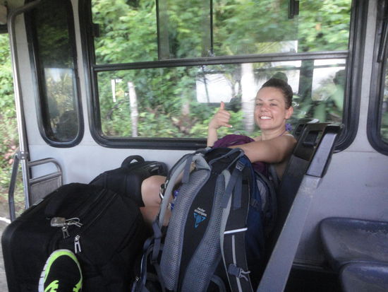 Erster Bus Richtung Quepos HB - 15 Minuten - die offene Türe bringt ein bisschen "kühle" Luft in unsere Gesichter
