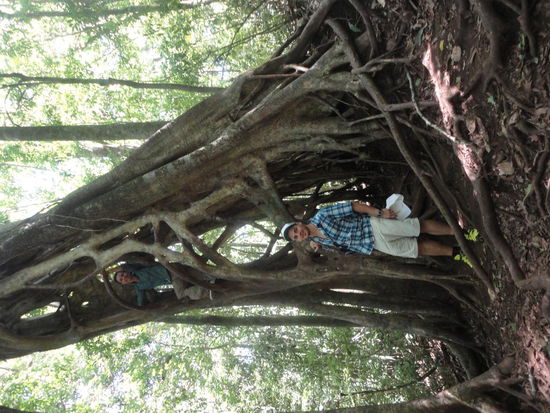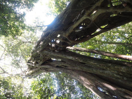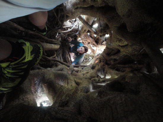 Wir wandern nach ca. 30 Minuten Fußmarsch einen kleinen etwas steileren Abhang hinab in den Wald. Zunächst wissen wir nicht, was es mit diesem Namen auf sich hat, doch plötzlich stehen wir vor einem wahnsinnig großen und schönen Baumgerüst, dem "Ficus Tree". Es handelt sich dabei um einen kräftigen Parasitenbaum, der sich vor vermutlich hunderten von Jahren um den Ursprungsbaum geschlungen und sich von diesem ernährt hat. Er hat ihn im Laufe der Zeit regelrecht aufgefressen. Geblieben ist nun nur noch das Gerüst des parasitären Baumes, welcher sich von innen ca. 20m hinaufklettern lässt. Wir erkennen ein leichtes Licht, welches auf das Ende des Baumkanals schließen lässt. Auf dem Weg nach oben brechen wir allerdings vorher ab, da wir befürchten dass es zu eng wird und wir nicht wissen, welche Tiere sich wohl da oben aufhalten. Leider erfahren wir erst nachher von zwei anderen Wanderern, dass man bis zur Baumkrone nach oben klettern und von einer natürlichen Plattform aus die Tiere, vor allem verschiedene Vogelarten, in den anderen Baumkronen beobachten kann.