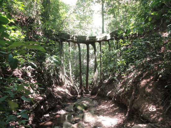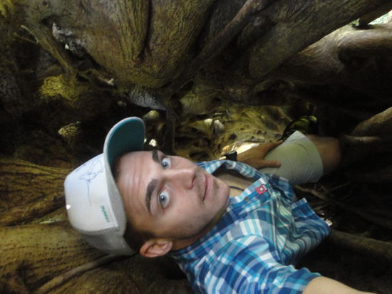 Weitere 45 Minuten Fußmarsch liegen nun vor uns, bevor wir wieder einen kleinen Eingang in den Wald ohne Beschilderung betreten, nachdem wir einen Einwohner nach dem Weg gefragt hatten. Der Weg endet an einem kleinen Bach, wir beschließen bachabwärts zu gehen und springen von Stein zu Stein  bis wir an einem mächtigen Wurzelkonstrukt, welches wie ein großes Eingangstor wirkt, ankommen. Dabei handelt es sich um einen Baum, dessen Wurzeln sich eigenständig den Weg in Richtung Wasser gesucht haben. Er hat sich quasi mehrere Kanäle errichtet (wie Ihr auf den Bildern erkennen könnt) und aus Stabilitätsgründen eine Brücke auf die andere Seite erbaut. Mir wird immer bewusster, zu was die Natur alles im Stande ist und wie intelligent sie agiert.