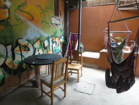 An der Bushaltestelle treffen wir zufälligerweise auch gleich die Schwester des Besitzers unseres Hostels "Cabinas El Pueblo" in Monteverde. Sie führt direkt das Hostel nebenan und die Mutter das Restaurant auf der gleichen Straße, welches natürlich jedem Gast als das preiswerteste und beste "most cheap and tradional restaurant" empfohlen wird. Jedenfalls sind wir froh, sie getroffen zu haben, da sie uns direkt zu dem Hostel führt. In der Wartezeit an der Bushaltestelle, die direkt am Meer mit Blick auf den Hafen und die Frachtschiffe gelegen ist, hole ich mir am kleinen Barbecue Stand (1 Mann, 1 Grill) einen Chickenspieß, welcher sich beim Verzehr als Schweinespieß entpuppt, trotzdem aber wirklich sehr fein schmeckt. Der Mann erzählt mir, dass er der berühmteste Barbecue-Grillmaster in Puntarens wäre und selbst die Leute, die den Hafen mit dem Schiff passieren, ihm die Spieße unter dem Hintern wegkaufen. Ich höre einfach nur aktiv zu und lasse die Zeit vergehen. Nadja übt in dieser Zeit ein bisschen Spanisch mit ihrem Spanischbuch.