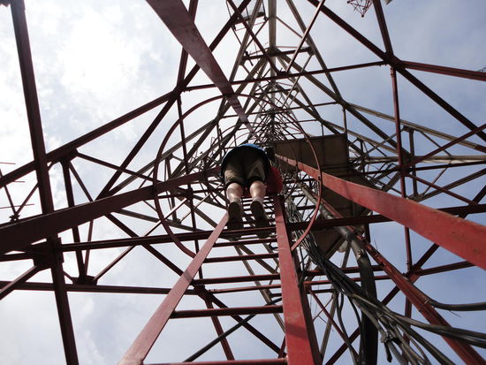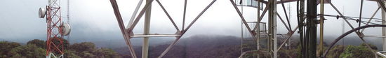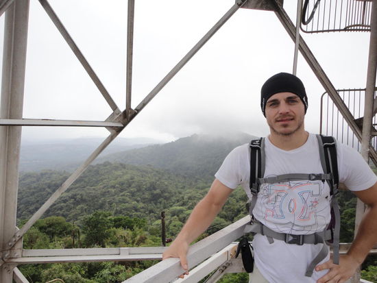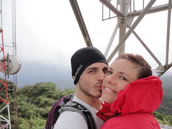 Am vorletzten Tag laufen wir zu den TV Towern hoch auf 1800m. Es ist ein sehr anstrengender Trail, der auch ein gutes Beinausdauertraining beinhaltet. Die Steigung liegt stellenweise bei 75 Grad und erinnert an die Harakiri Piste in Österreich. Auf dem Weg nach oben treffen wir das Wohngebiet einer schwarzen Hummel-Spezies. Sie wohnen in ca. 1cm großen Löchern im Boden. Als wir diesen Teil des Weges passieren, erscheinen plötzlich sehr viele dieser Biester, fliegen nahe um uns herum und verfolgen uns bis wir das Wohngebiet verlassen (ungefähr 200m). Nadja geht ganz selbstverständlich ruhig da durch, ich schwanke zwischen hektischem Herumgeschlage und kleinen Sprints, bis sie endlich weg sind. Nach ca. 2,5 Stunden kommen wir durchnässt oben an, mittlerweile sind die Temperaturen stark gefallen und auch der Wind hat deutlich an Fahrt zugenommen. Die großen Fernsehtürme stehen nun vor uns, ein Arbeiter von dort begrüßt uns mit einem freundlichen "Hola como estas?" und bietet uns an, einen der Türme hochzuklettern und Fotos zu schießen. Das Hochklettern stellt sich als eine Herausforderung dar, wer schonmal so eine Leiter hochgeklettert ist, kann das Gefühl ggf. nachvollziehen. Auf jeden Fall hat es sich gelohnt, der Ausblick und die Atmosphäre auf der Plattform sind besonders.