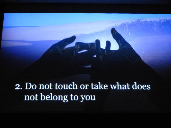 Then he created the Butchulla People at Mooen (Moon Point). Yindingie taught all these living creatures and people the Magic of Procreation, so that K'gari would never be lonely. Yindingie took the people right over the whole island, teaching them where they had to live and what they had to do. When they got back to Mooen, he stepped across the sea to a place known today as Dayman Point and then took another step onto the top of the lovely mountain in the distance. He turned around to face the people at Mooen Point and named them Butchulla People. He put his left arm pointing to Burrum Heads in the north. Then he put out his right arm pointing to Teewah Beach in the south. He nodded his head at the land lying between his arms and said "Now this is your land, but you must look after it. I will give you three laws which you must keep, and which you must pass on to your children and to their children and so on forever".