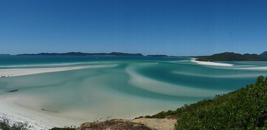 Am zweiten Tag steht der Whitehaven Beach auf der Whitsunday Insel auf dem Programm. Wir werden an einem dicht bewaldeten Stück Insel abgesetzt, laufen durch das Dickicht und dann sieht man ihn: den schönsten Strand der Welt !!! Weißer Sand, wie in einer Lagune! Wer hier schwimmen will, muss leider auch den stingersuit anziehen Wir sehen später noch besser die verschiedenen Blau- und Türkis-Töne der Bucht von einem höher gelegenen Aussichtspunkt. Wahnsinn!