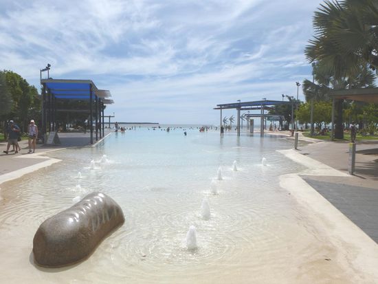 Cairns hat ein große "Lagoon", da man auch hier nicht im Meer baden kann. Wie unfair: das schönste Meer vor der Haustür und die 8-monatige Stinger-Saison verdirbt einem alles! Hinzu kommen noch die Gezeiten. Jedes Mal, wenn ich vorbeikomme, ist das Meer gerade nicht da! Die Stadt ist übersichtlich und ich finde kaum Gebäude, die mehr als 2 oder 3 Stockwerke hoch sind, zumindest nicht in Cairns CBD. Das rechtwinklig angelegte Straßennetz hilft, sich schnell zu orientieren.