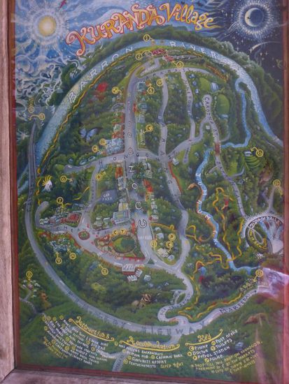 In Kuranda stelle ich fest, dass der ursprüngliche "Rainforest Market" fast ein Schattendasein führt. Zu groß ist die Konkurrenz durch die neueren Märkte, die größtenteils Waren anbieten, die nicht in Australien produziert wurden. Wie schade! Interessant ist noch der Heritage Market, hier werden Produkte aus dem Regenwald verkauft, zB. wunderschöne Halsketten aus Samen der Bäume, die hier wachsen. Urplötzlich ein Regenschauer. Die Umherschlendernden flüchten sich unter die Planen der Stände.