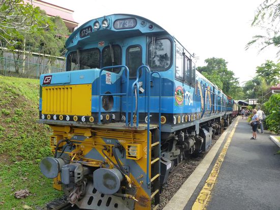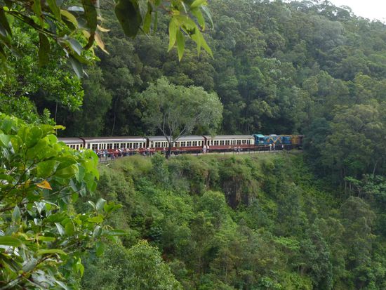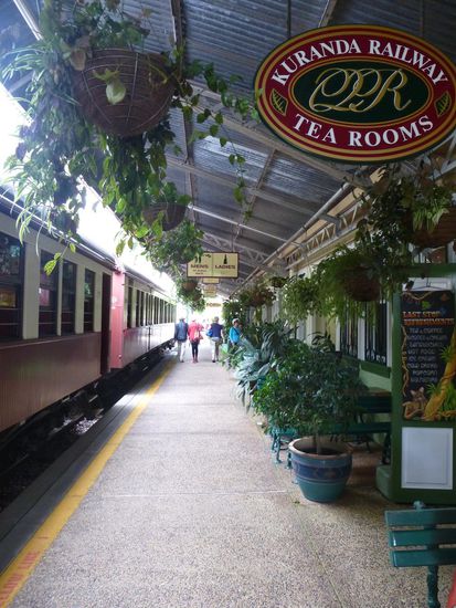 Die Fahrt im historischen Zug nach Kuranda ist wirklich ein Erlebnis! Eingleisig windet sich die Strecke die Hügel hinauf, führt an Wasserfällen vorbei durch mehrere Tunnel in den tropischen Wald. In einer Haarnadelkurve sieht man hervorragend das vordere Ende des Zuges mit den beiden Antriebswagen. Die Wagen selbst sind innen mit Holz verkleidet, die Sitzbänke dick gepolstert. Der Bahnhof von Kuranda erinnert an die Kolonialzeit. Zumindest, so wie ich sie mir vorstelle Die Bahnsteige sind mit verschiedenen Farnen bepflanzt. Es gibt ein historisches Café, in dem man seinen Morning Tea einnehmen kann. Alles sehr britisch.
