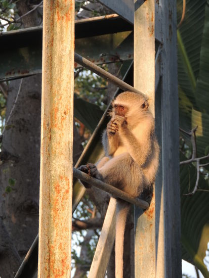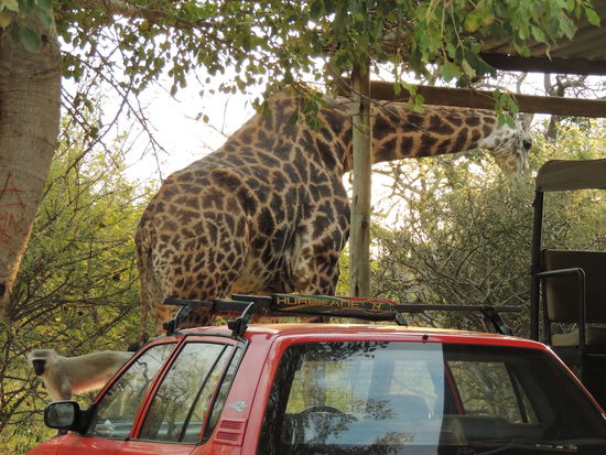 Als wir auf dem Parkplatz der Lodge ausstiegen, wurden wir erstmal von einer Giraffe und mehreren Affen empfangen. Was für ein Willkommensgruß!