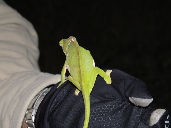 Wir fuhren weiter im Dunkeln die Wege entlang. Bis unser Guide Wesley bei voller Fahrt etwas in einem Baum entdeckte. Er stieg aus und pflückte ein Chamäleon vom Baum! Wie er es bei voller Fahrt im Scheinwerferlicht und gut getarnt sehen konnte, ist mir immer noch unbegreiflich...