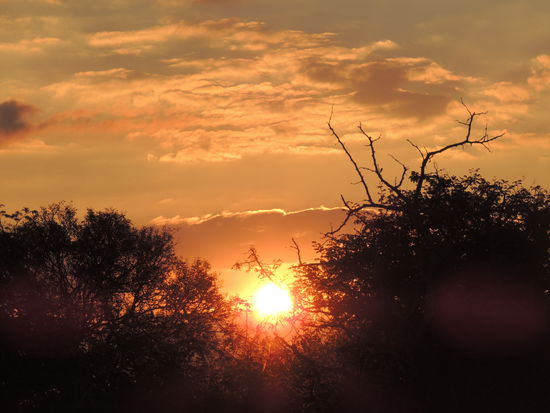 Nach 15 Minuten startete schon unsere erste Fahrt in den Busch, wie aufregend! Mit einem offenen Wagen fuhren wir den Sonnenuntergang entgegen. Wir sahen Büffel, Impalas, Giraffen und einen Elefanten. Auch der Sonnenuntergang war sehr schön. Leider wurde es recht schnell dunkel und wir konnten den Elefanten nur mit Hilfe des Scheinwerfers sehen. Es war trotzdem eine tolle Erfahrung, zwar kein Vergleich zu den nächsten Tagen, aber das wusste ich da ja noch nicht