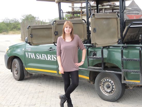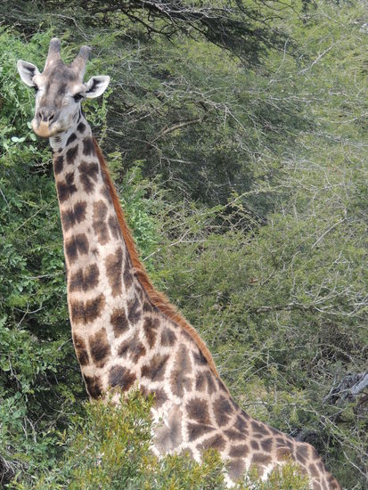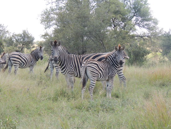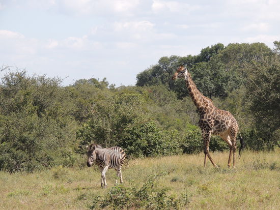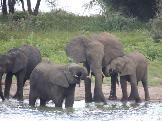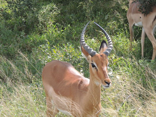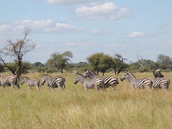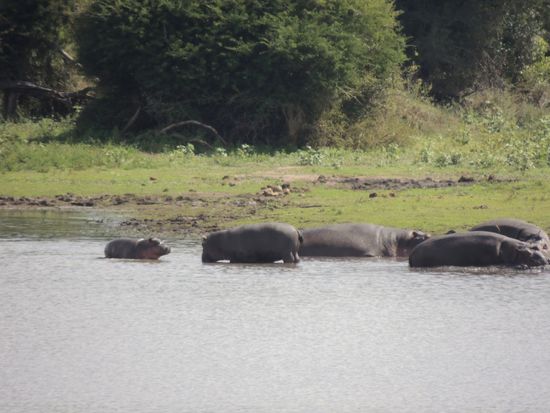 Wir sahen viele Zebras, Giraffen und Impalas. Teilweise standen sie sehr dicht am Wagen oder kreuzten die Straße. Ab und zu sahen wir in der Ferne einen Elefanten durch die Büsche streifen. Außerdem sahen wir viele bunte Vögel und Geier, die in der Luft kreisten. Bald entdeckten wir ein Wasserloch mit einer Gruppe von Hippos und einem Krokodil. Hippos wirken zwar ruhig und gelassen, sie zählen aber zu den gefährlichsten Tieren Afrikas!