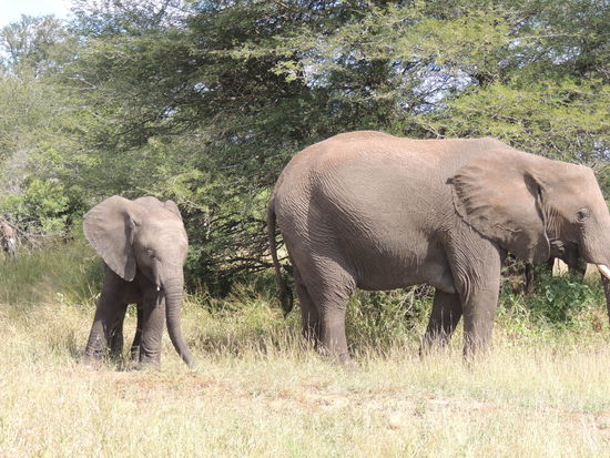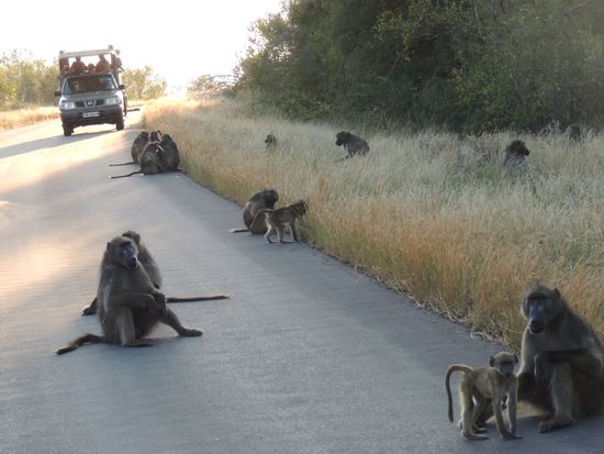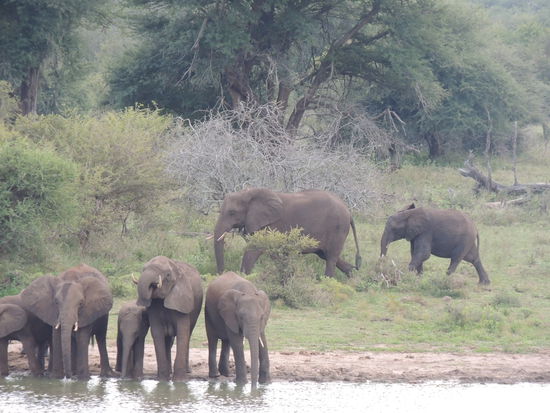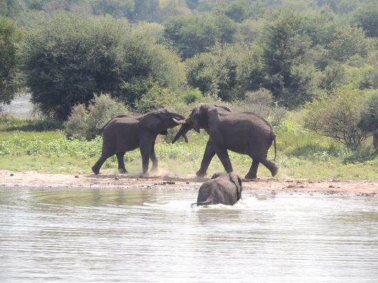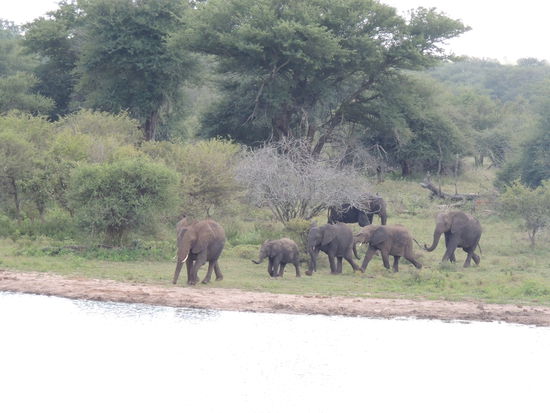 Wir fuhren weiter und entdeckten eine große Elefantenherde. Gigantisch, es waren auch einige Jungtiere dabei. Bald bemerkten wir, dass die Herde auf dem Weg zum Wasserloch sein musste. Wir fuhren zurück und sie tauchten tatsächlich auf. Wir erlebten eine Szene, die aus einer Tierdokumentation hätte stammen können. Die Elefanten spielten im Wasser, die Babys waren einfach nur süß und es war einfach nur toll ihnen dabei zuzusehen. Einige Jungbullen versuchten ihr Glück und forderten den Anführer heraus. Wir erlebten 2 kleine Kämpfe mit. Bald wurde es dem Bullen zu bunt und er trompetete zum sofortigen Aufbruch. Alle gehorchten aufs Wort und sie verschwanden wieder in den Weiten des Krüger Parks. Was für ein Erlebnis!