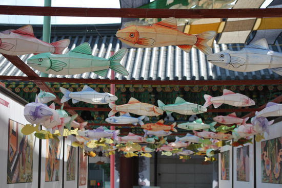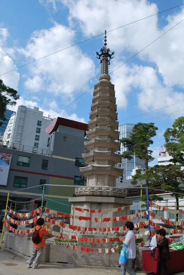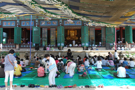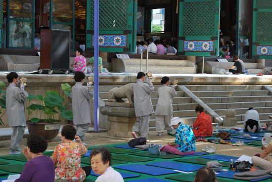 13.08.2013: Nach einem sehr guten Frühstück im Hotel begebe ich mich auf die obligatorische, halbtägige Stadtrundfahrt. Zuerst besuchen wir den größten buddhistischen Tempel Seouls, erbaut 1938. Vom Stil her sind koreanische Tempel ganz anders, als japanische. Vor allem die Farben finde ich hier sehr schön. Innen befinden sich 3 große Buddhastatuen. Zum Zeitpunkt unseres Besuches findet gerade eine gut besuchte Zeremonie statt, sodass wir leider nicht hineinkönnen.