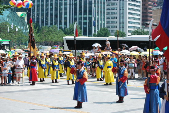 Mir kommt der Gedanke, dass die Palastwächter eventuell einfach nur engagierte Schauspieler sind, die die Zeremonie sicherlich nach historischem Vorbild eingeübt haben. Ich kann mir nicht vorstellen, dass ein Land wie Südkorea echt Staatsdiener gutbezahlt (?) 3 x täglich in diesen Kostümen die Touri-Nummer auf Staatskosten durchziehen lässt. Aber ist ja auch egal, schöne Fotos gibt es und die Besucher des kleinen Landes ziehen anschließend hochzufrieden und schwerbegeistert von dannen...